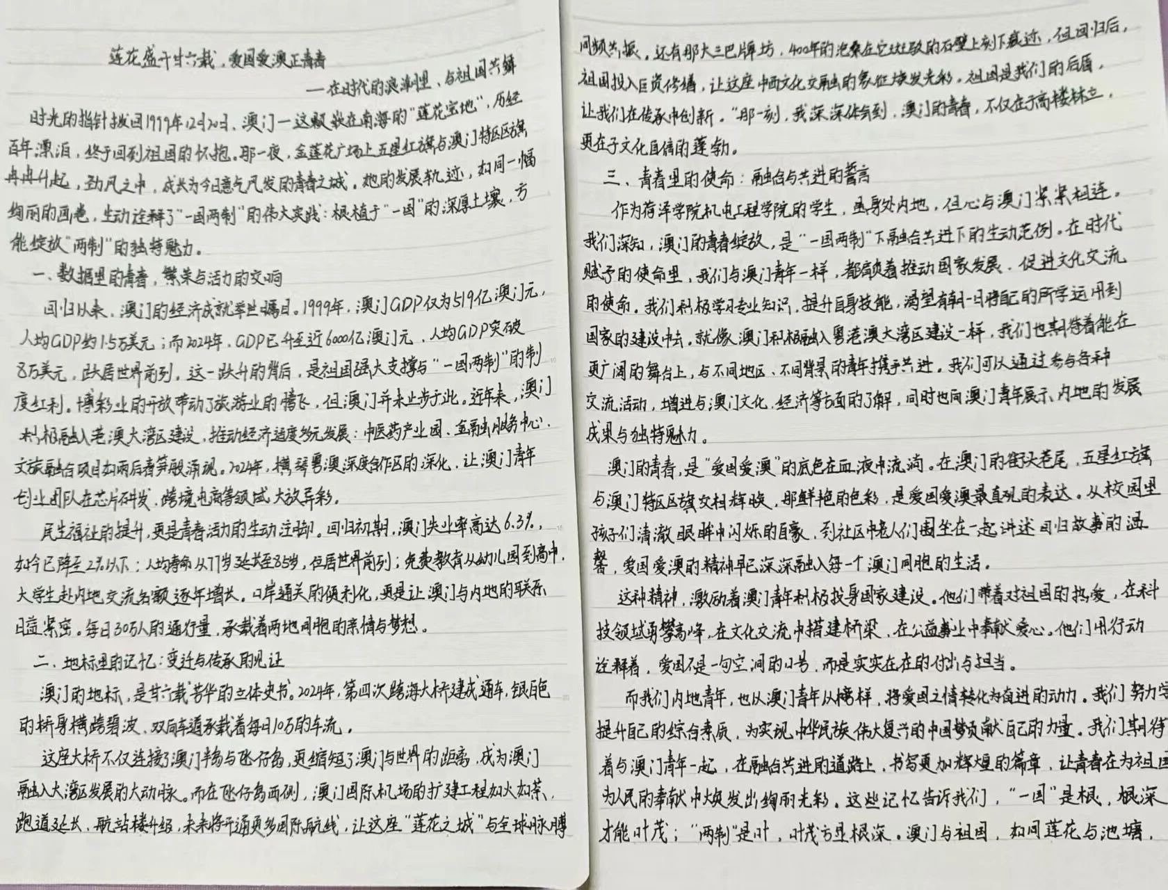 12月20日,在澳门回归26周年之际,学院宣讲团举办了“廿六载芳华,澳门正青春”征文比赛。同学们查阅相关资料,认真构思文章脉络,用青春之笔写下自己的爱国情。通过写作,同学们仿佛重回了那个令人心潮澎湃的时刻,重温澳门历经沧桑后回到祖国母亲怀抱的庄严与喜悦。这不仅为我院学子搭建了展示才华的舞台,更有助于深刻理解国家统一与民族复兴的艰辛历程,激发共建未来的使命感。